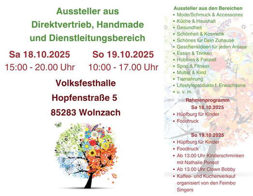 Mode, Schmuck & Accessoires, Küche & Haushalt, Schönes für dein Zuhause, Gesundheit, Schönheit und Kosmetik, für einen selbst oder als Geschenk zu jedem Anlass. Rahmenprogramm mit Foodtruck, Kinderschminken, Hüpfburg und Clown. Kaffee und Kuchen organisiert von den Feimbo Singers.